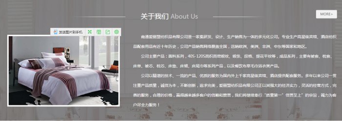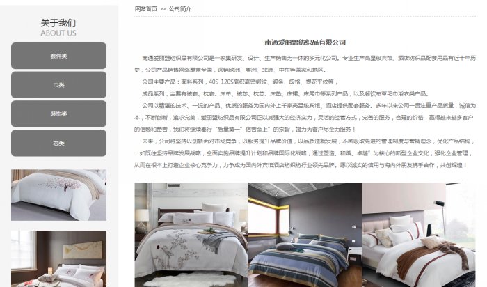 南通愛(ài)麗盟紡織品有限公司是一家集研發(fā)、設(shè)計(jì)、生產(chǎn)銷(xiāo)售為一體的多元化公司。專(zhuān)業(yè)生產(chǎn)高星級(jí)賓館、酒店紡織品配套用品有近十年歷史,公司產(chǎn)品銷(xiāo)售網(wǎng)絡(luò)覆蓋全國(guó),遠(yuǎn)銷(xiāo)歐洲、美洲、非洲、中東等國(guó)家和地區(qū)。公司主要產(chǎn)品:面料系列,40S-120S高織高密緞紋、緞條、段格、提花平紋等,成品系列,主要有被套、枕套、床單、被芯、枕芯、床墊、床裙、床尾巾等系列產(chǎn)品,以及餐飲布草毛巾浴衣類(lèi)產(chǎn)品。