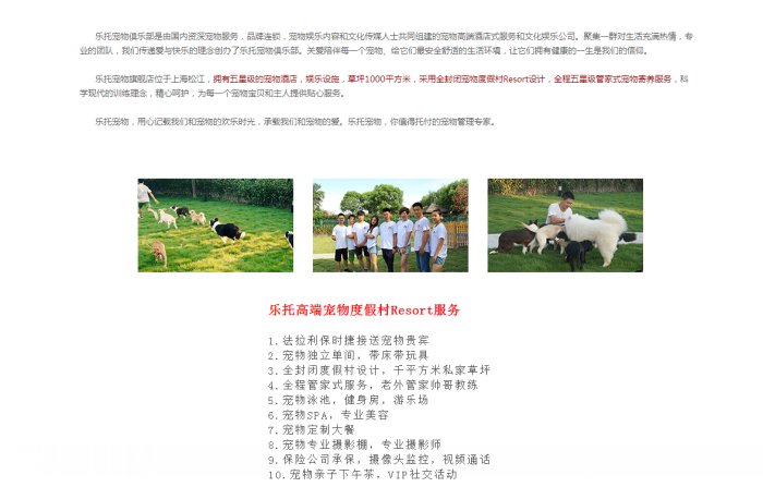 樂(lè)托寵物俱樂(lè)部是由國(guó)內(nèi)資深寵物服務(wù),品牌連鎖,寵物娛樂(lè)內(nèi)容和文化傳媒人士共同組建的寵物高端酒店式服務(wù)和文化娛樂(lè)公司。聚集一群對(duì)生活充滿熱情,專業(yè)的團(tuán)隊(duì),我們傳遞愛(ài)與快樂(lè)的理念創(chuàng)辦了樂(lè)托寵物俱樂(lè)部。關(guān)愛(ài)陪伴每一個(gè)寵物、給它們最安全舒適的生活環(huán)境,讓它們擁有健康的一生是我們的信仰。