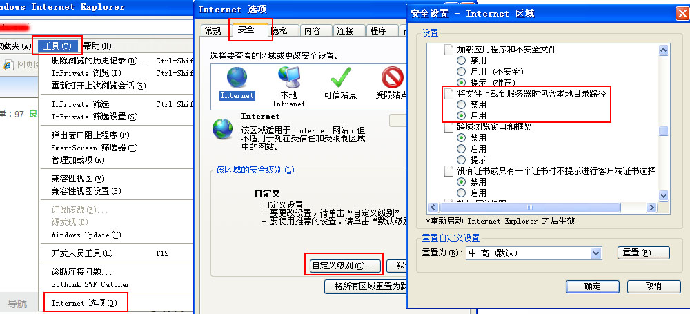點瀏覽器上的工具——Internet選項——安全——自定義級別——“將文件上載到服務(wù)器時包含本地目錄路徑”改為啟用。如下圖: