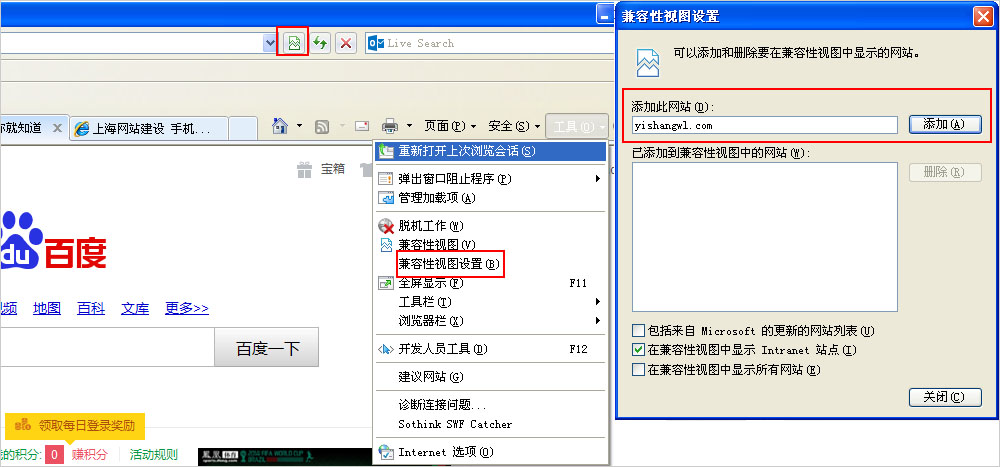 可以在瀏覽器網(wǎng)址的后面按鈕那里直接點擊,或者點擊工具下面的“兼容性視圖設(shè)置”那里添加,如圖: