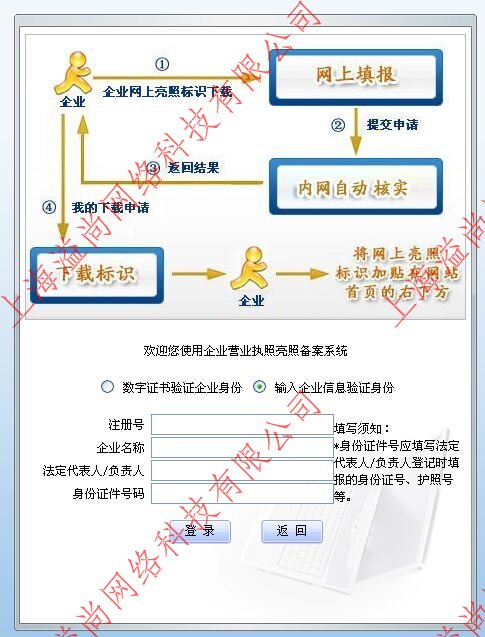 點(diǎn)擊“企業(yè)網(wǎng)上亮照標(biāo)識(shí)下載”模塊,輸入“用戶名”和“密碼”進(jìn)行登錄(首次登錄的用戶須先進(jìn)行注冊(cè)),進(jìn)入“企業(yè)營(yíng)業(yè)執(zhí)照亮照備案系統(tǒng)”頁(yè)面,輸入企業(yè)信息(企業(yè)標(biāo)識(shí)、注冊(cè)號(hào)、企業(yè)名稱、法定代表人/負(fù)責(zé)人、證件號(hào))驗(yàn)證身份。已經(jīng)領(lǐng)取數(shù)字證書(shū)(營(yíng)業(yè)執(zhí)照電子副本)的企業(yè),可直接用數(shù)字證書(shū)驗(yàn)證企業(yè)身份。