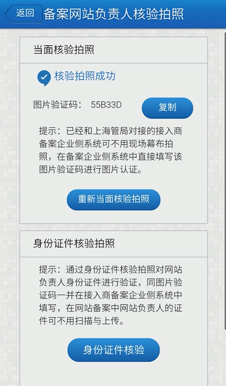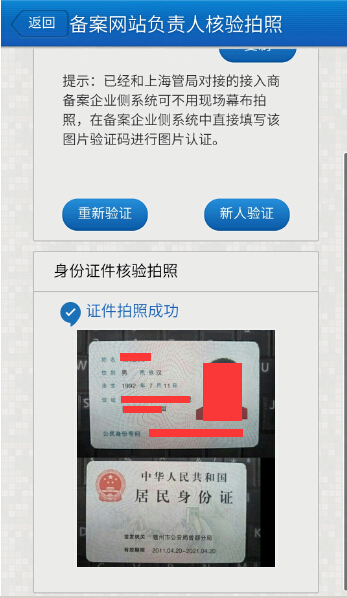 重新驗(yàn)證:如果您的核驗(yàn)拍照環(huán)境光線(xiàn)不清楚時(shí),可以選擇重新驗(yàn)證。點(diǎn)擊會(huì)重新進(jìn)入備案網(wǎng)站手機(jī)當(dāng)面核驗(yàn)拍照,驗(yàn)證成功將替換上次手機(jī)核驗(yàn)拍照?qǐng)D片。